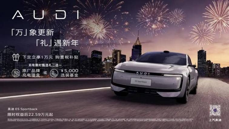 行业权威认证的加持,让新春购车季的奥迪 E5 Sportback更具吸引力,同时恰逢上汽集团启动“懂车更懂你,马上焕新驾——2026上汽新春欢乐购”,上汽奥迪同步推出重磅购车礼遇:2026年1月31日前,购车立享10,000元购置税补贴,另可获赠原厂品牌充电墙盒(含安装)或尊享5,000元选装基金。如果说“中国年度车”大奖是给消费者的“品质定心丸”,这份实打实的权益让利便是品牌的诚意回馈,让更多人有机会轻松拥有这款行业认可的豪华电动标杆车型。