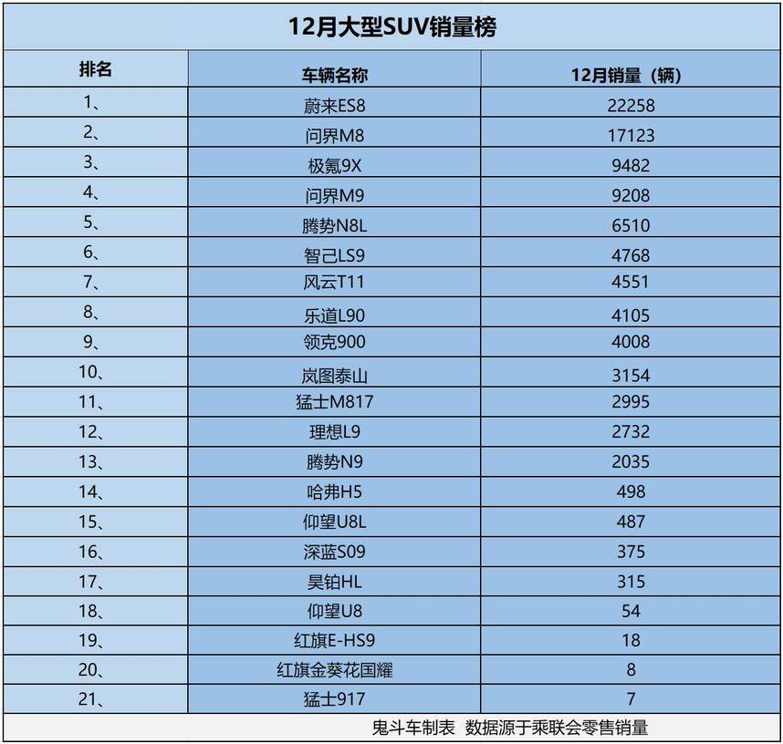 结果发现,榜单上,只有两款大型SUV在12月零售销量过万,不少车型是有声量没销量。接下来,看看榜单具体排名与销量表现。榜单上,排名第一位的车型是蔚来ES8,12月零售销量达到22258辆,这款车型焕新上市后,价格与产品力进行了双双调整,性价比上凸显出新的优势,销量冲到榜首位置。