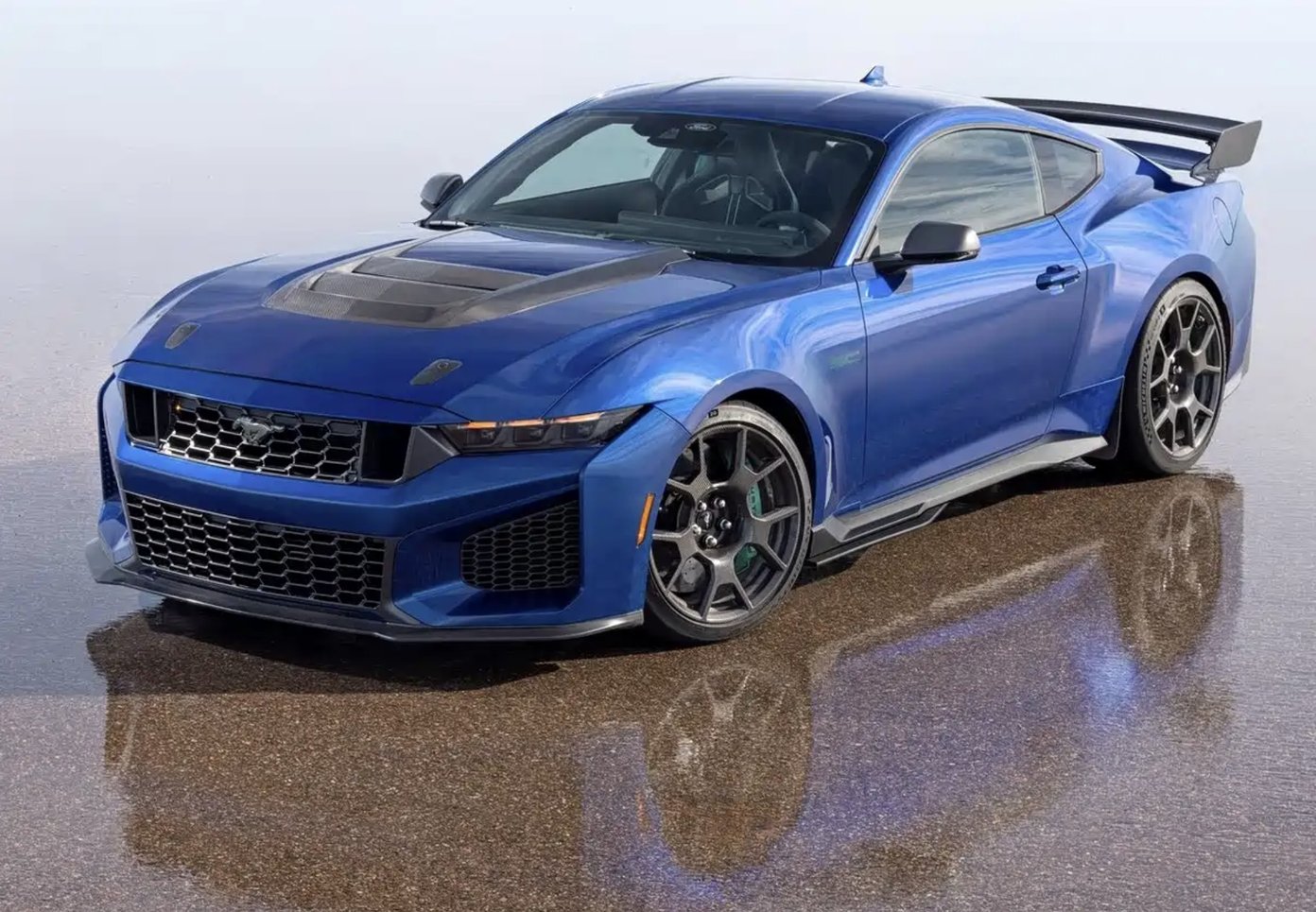 外观方面,新车延续美式肌肉车的硬核基因,采用隆起式碳纤维机舱盖设计,不仅视觉冲击力十足,更优化了动力系统散热效率。前脸配备蜂窝网状格栅,搭配三分式前包围进气开口,宽体翼子板与21英寸双五辐轮圈、蓝色制动卡钳相得益彰,尽显运动张力。尾部造型极具辨识度,大尺寸扰流板提供强劲下压力,三段式双层尾灯、双边共四出排气布局与扩散器组合,将性能气息拉满。
