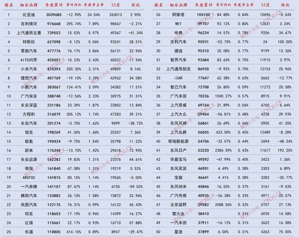 2025新能源细分品牌销量百强:广丰、日产涨超10倍,合资逆袭?