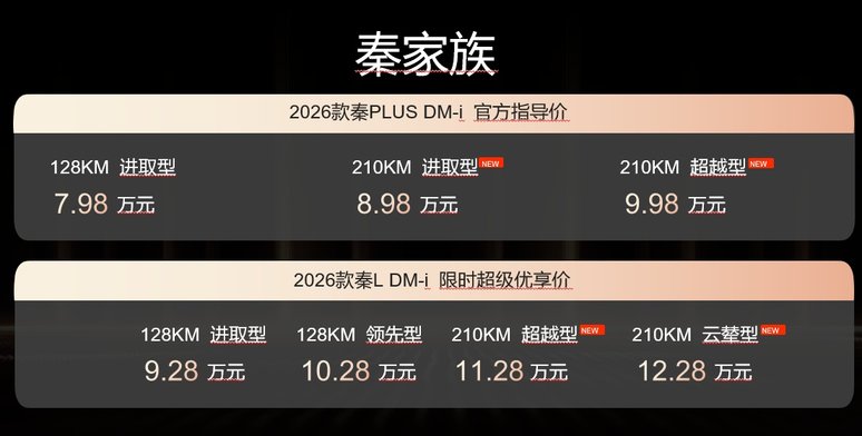 210KM超长续航起步 2026款秦家族DM-i重新定义插混家轿性价比