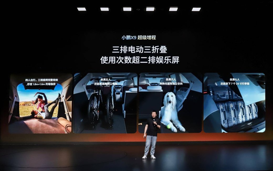 空间灵活性同样领先行业,小鹏 X9 超级增程满足用户丰富出行场景需求。全球首发的三排电动三折叠功能,随时化身可一键切换的“移动LOFT”。该车支持三排4/6分独立收纳,可无缝切换7座满员、6座带宠物、5座载自行车、4座露营大床房等多元模式,真正实现一车搞定通勤、带娃、社交、远行多种出行场景。