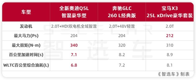 从参数来看,宝马X3虽然发动机功率最大,但峰值扭矩则是全新Q5L有优势,因此百公里加速时间也最快,看来加入了HDI双电机智混系统确实管用,起步时电机可以带来明显助力,油耗也要比奔驰GLC和宝马X3更低。