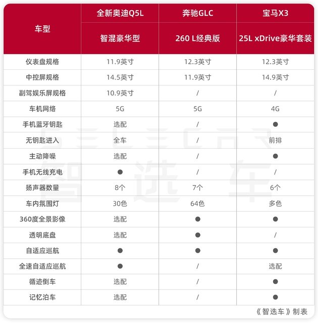 其余配置方面,三款车的入门版各有优劣,比如全新奥迪Q5L多出了手机无线充电和全速自适应巡航;奔驰GLC多出了透明底盘功能;宝马X3则多出了手机蓝牙钥匙、主动降噪、循迹倒车和记忆泊车功能。