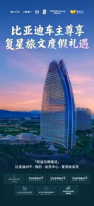 此次权益互通的落地,是双方深化 “出行 + 度假” 生态协同的关键一步,通过品牌价值的跨界延伸,为千万比亚迪车主带来超越出行本身的增值体验。未来,比亚迪将持续深化与复星旅文的合作,为用户打造“绿色可持续的出行与高品质度假深度融合”的生活方式。