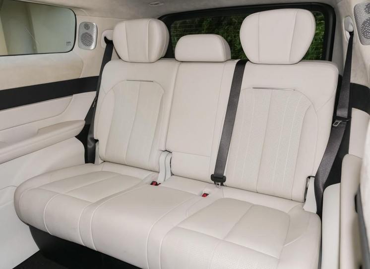 座舱内坐姿较高,A柱倾斜较大,增加了固定三角窗提升视野。仪表台布局简约,出风口是隐藏式布置,台面大部份被软性皮面覆盖,触感还不错。提供10.2英寸液晶仪表屏和和15.4英寸的中控屏,中高配车型还有19.8英寸HUD抬头显示和256色主动式氛围灯。标配14个喇叭音响系统,可以选装27喇叭“无界之声”音响系统,功放功率达2300W,声音品质高很多。前排双手机位都带50W无线快充,还有丰富的储物空间。