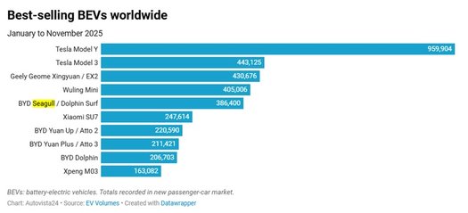 然后我们再看具体车型的全球销量。在海外媒体的榜单当中,我们可以发现在全球销量前十的纯电动车BEV当中(2025年1-11月),比亚迪占了4款,分别是Seagull(海鸥)、Atto2(元Up)、Atto3(元PLUS),以及Dolphin(海豚)。
