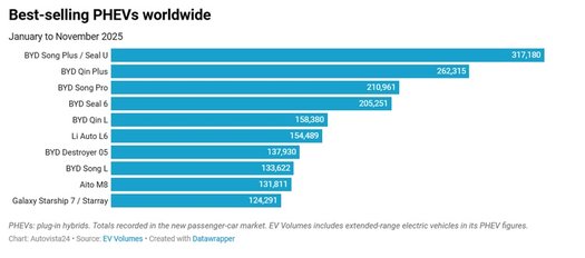 其次是插混车PHEV(图表包含增程式REEV)在2025年1-11月的销量数据,比亚迪的趋势更猛,直接统治前五名。比亚迪Seal U(宋PLUS)当属年度销冠车型,达到了317,180辆,其次是秦PLUS,达到了262,315辆,后续的车型还有宋Pro、海豹06、秦L、驱逐舰05,以及比亚迪宋L等等。
