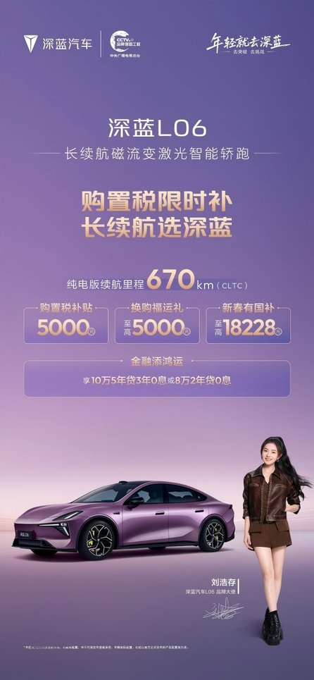 同时,深蓝L06以满满诚意推出多重购车福利,大幅降低智能座驾拥有门槛。消费者购车即享5000元购置税补贴、至高5000元换购福运礼、至高18228元新春国补,金融方案可享10万5年贷3年0息或8万2年贷0息。年轻消费者无需背负高额资金压力,就能轻松入手这款颜值与续航兼备的智能轿跑。