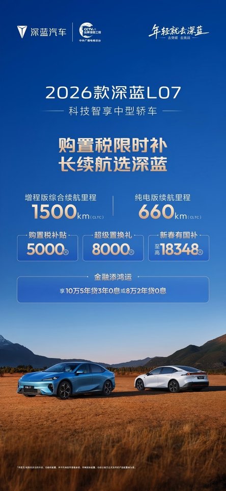 马年行好运,新春购新车。深蓝汽车带着满满的诚意与惊喜,为大家带来了令人心动的购车优惠方案。选择深蓝汽车,也就意味着将同时获得 “央企品质保障、长续航核心优势、全系限时补贴” 三重利好。2026,和深蓝一起,即刻焕新座驾,为你的新年增添更多欢乐与温暖,赶紧行动起来吧!