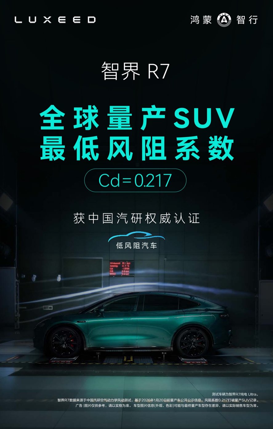 中汽研专业风洞实验室统一采用120 km/h、23 ℃的标准工况,测试流程与数据标定均按国家级规范执行。智界R7纯电Ultra版在此条件下测得0.217,获得“全球量产SUV最低风阻”认证,成绩客观、公正,为这一纪录提供了权威背书。