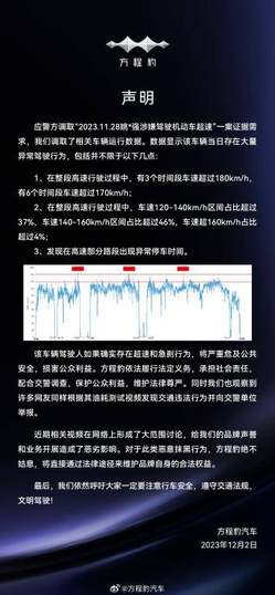2023 年 12 月,方程豹豹 5 上市之际,姚*强通过抖音账号“大秦军陕团”发布视频,声称以正常驾驶方式测试方程豹旗下车型豹5,得出百公里油耗18升的结论,在网络上引起了大范围的关注及讨论。之后应警方调查取证需要,比亚迪调取数据显示:测试当日车辆存在大量异常驾驶行为,高速行驶过程中有3个时段车速超过180km/h, 有6个时段车速超过170km/h,在整段高速行驶过程中,车速120-140km/h区间占比超过37%,车速140-160km/h区间占比超过46%,车速超160km/h占比超过4%。