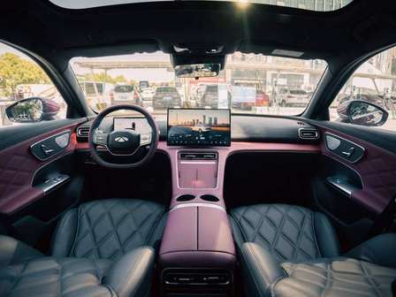 进入车内,风云A9的内饰采用了极简风格,但用料和配置均保持了领先水平,整车配备了内嵌式液晶仪表和悬浮式大尺寸中控屏,并保留了必要的物理按键以提升操作便利性。智能化核心配置方面,整车搭载了基于3nm制程的联发科8678芯片,并配备AI灵犀智舱系统,配合专属的Carmind智能体,提供了高达50TOPS的AI算力,实现了自然迅捷的人机交互体验。在娱乐体验上,全车搭载了23扬声器“伯牙之音”音响系统,总功率高达1080W,并支持AI无麦K歌功能,将座舱打造成一个移动的沉浸式音乐厅。