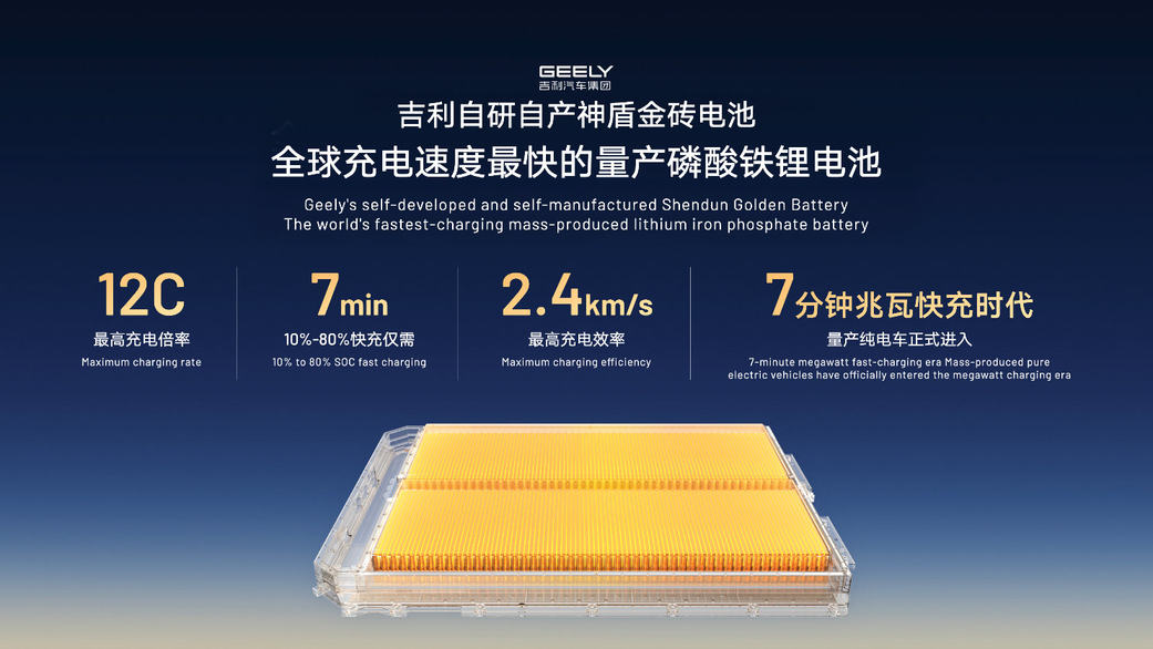在动力电池领域,吉利神盾金砖电池最高充电倍率可达12C,是目前全球充电速度最快的量产磷酸铁锂电池,10%~80%电量补能最快仅需7分钟,推动量产纯电车进入“7分钟兆瓦快充时代”。