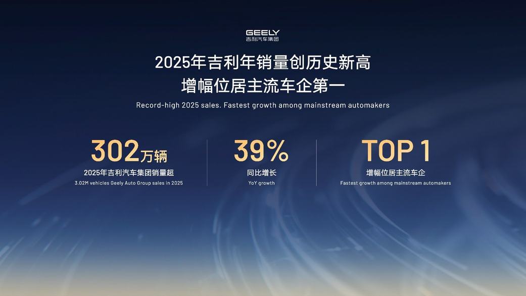 2025年,吉利汽车集团累计销量302万辆,创下历史新高,同比增长39%,增幅位居主流车企第一位。2026年,吉利汽车集团将全年销量目标定为345万辆,其中出口销量目标64万辆。基于此,吉利将践行“区域深耕”+“全球协同”的全球化战略,并将在全球打造3个15万级、2个10万级区域市场,持续向全球市场输出高价值智能精品车,稳步推进高质量出海。