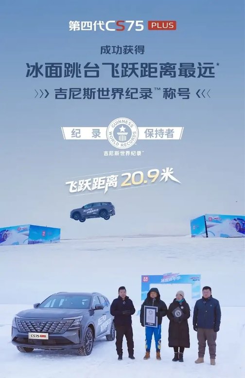 结语:从冰原疾驰、凌空飞跃到稳健着陆,长安第四代CS75PLUS以一场在权威目光下的极限挑战,完整演绎了由“新动力、新智能、新安全”构成的燃油车核心竞争力。在央视与吉尼斯的双重认证下,这项纪录不仅衡量了距离,更定义了新时代燃油车的可靠高度,也意味着这份更高的安全冗余为用户日常出行带来更多的可靠和安心。未来,长安汽车将继续坚守以用户为中心的初心,融合智能科技与匠心制造,持续打造高品质、高性能的出行产品,助力中国汽车工业向上迈进。