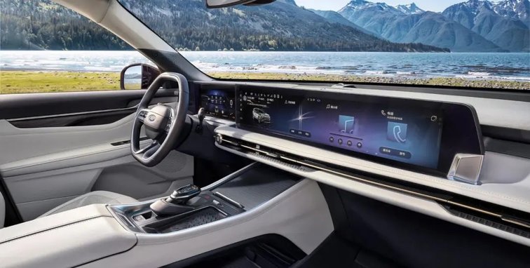 内饰部分,车内的科技感很强,进到车内最吸引眼球的就是这块大尺寸的屏幕,这块一体式屏幕有27英寸,分辨率4K,实际看起来视觉效果很不错,清晰度高,然后仪表盘是一块12.3英寸的全液晶仪表。在车机系统方面,福特锐界L是搭载了SYNC+ 2.0系统,这套系统其中一个特色是加入了百度人工智能。