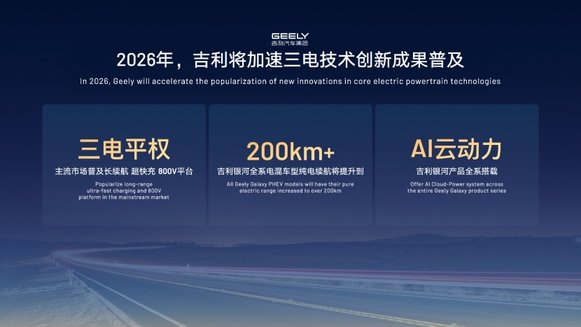 2026年是吉利的产品大年,每个季度都将推出1-2款全新产品,包括多款全新混动车型与全新一代醇氢能源车型,全面覆盖从主流到豪华、从燃油、到新能源的各个细分市场,全力冲击345万辆的年度销量目标。