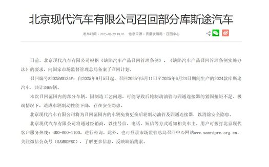 2025年初,北京现代因后轮制动油管连接紧固扭矩不足可能导致制动性能受到影响的问题,召回了3469辆库斯途MPV。这并非孤例,2024年底,北京现代也曾因高压燃油管端口制造问题可能导致汽油渗漏,召回了少量全新索纳塔和途胜L车型。