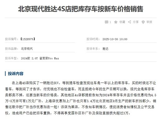 在消费者投诉平台上,北京现代多款车型上榜。胜达被投诉将库存超过一年的车辆按新车销售;ix35则被曝出中控屏边框无故开裂、车辆无法启动和仪表黑屏等电路故障。