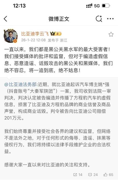 比亚迪诉姚*强(抖音账号“大秦军陕团”)侵权一案已落下帷幕,比亚迪法务部正式发布公告,宣告本案胜诉。1月22日,该公告披露,法院经审理查明,被告姚*强故意编造并扩散关于方程豹汽车的不实信息,此举严重侵害了比亚迪及方程豹品牌的商业信誉与商品声誉,已构成商业诋毁行为,最终判决姚*强向比亚迪支付合计201万元赔偿款。比亚迪集团品牌及公关处总经理李云飞第一时间转发该公告,并作出明确表态:“一直以来,我们都是黑公关黑水军的最大受害者!我们接受媒体的批评和监督,但对于编造虚假信息、恶意造谣、诋毁攻击的黑公关和黑媒体,我们绝不容忍,一追到底,绝不姑息!”