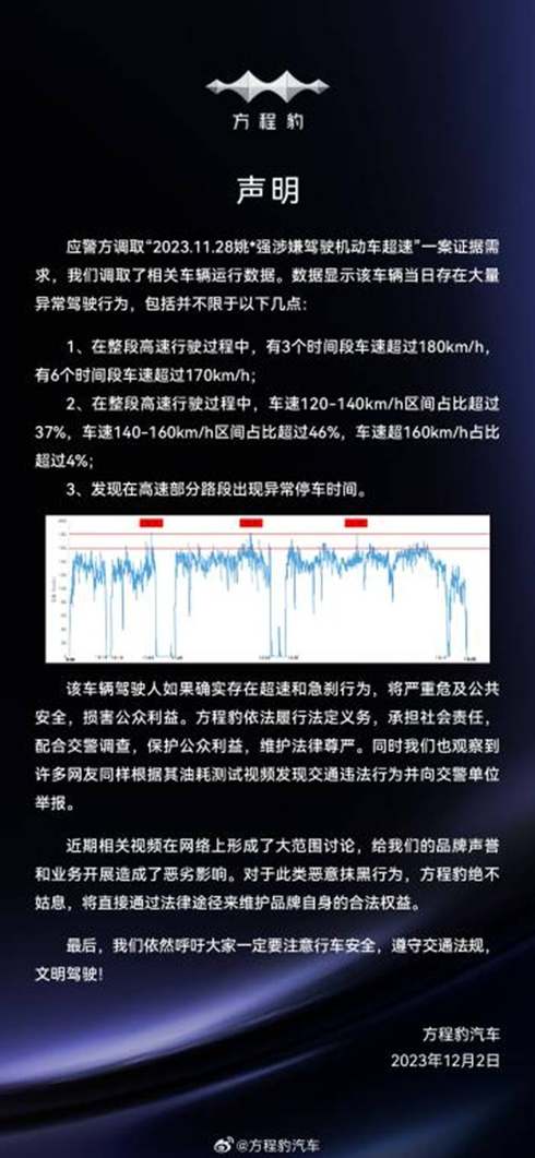 时间回溯至2023年12月,方程豹豹5正式上市之际,姚*强通过其运营的抖音账号“大秦军陕团”发布测试视频,谎称以常规驾驶模式对豹5进行测试,得出百公里油耗高达18升的结论,该视频迅速在网络上发酵,引发大规模热议与关注。后续配合警方调查取证工作,比亚迪调取的车辆数据揭穿了真相:测试当日,该车辆存在大量违规异常驾驶操作,高速行驶阶段,有3个时段车速突破180km/h,6个时段车速超170km/h,其中120-140km/h、140-160km/h车速区间占比分别达37%以上、46%以上,车速超160km/h的占比亦超过4%。