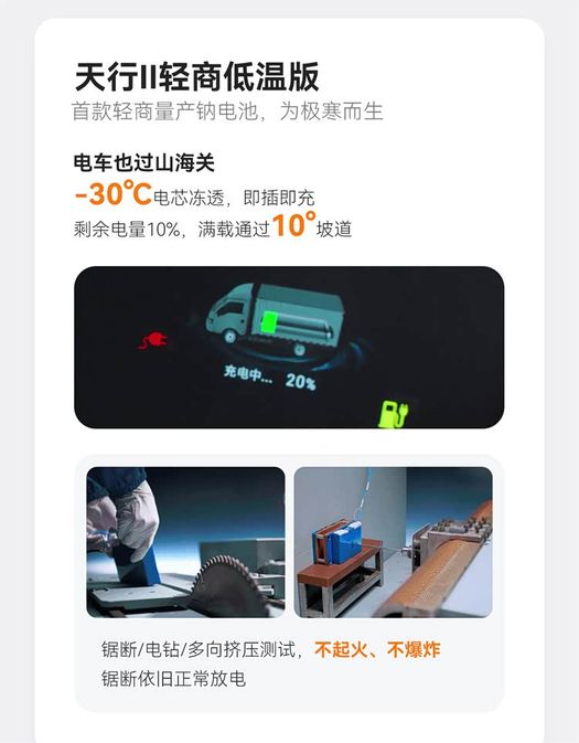在“天行II”的系列解决方案中,低温版的定位尤为特殊。它并未执着于极致的能量密度或充电速度,而是直指长期困扰电动车、尤其是商用车的核心痛点——低温性能。该版本搭载的钠离子电池,能实现零下20℃环境下可用电量仍超92%,即便身处零下30℃的极寒之中,无需热车就能直接充电。这份底气,源于钠离子电池与生俱来的材料本征优势。