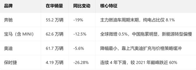电动化步伐迟缓成为首要障碍。一方面纯电占比严重不足,与市场渗透率严重脱节:2025年奔驰全球纯电销量16.88万辆,占比仅11%且同比下滑7.8%,在华占比低至8.1%;奥迪纯电未形成规模优势;保时捷受困于纯电供应不足,Macan油电车型青黄不接,老款燃油车型因法规提前退市,供应端缺口明显。