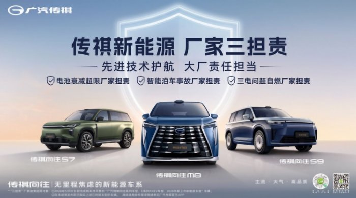 为了给用户提供全周期的安心保障,广汽传祺于2025年12月28日正式发布新能源车“三担责”承诺,传祺向往S9作为对象车型之一,在政策发布前已购买或在2026年12月31日前下订的用户,厂家直接承担电车自燃责任、智能泊车事故责任、电池衰减责任,切实解决新能源用车之忧。