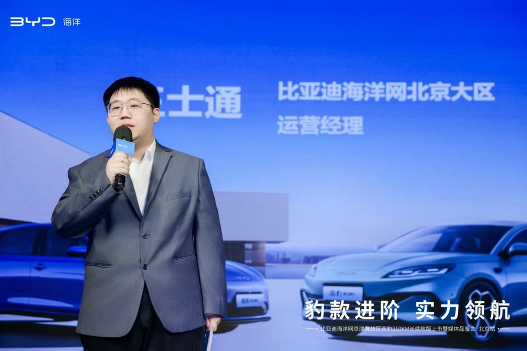 活动开场,比亚迪海洋网北京大区运营经理王士通先生登台致辞。他重点阐述了推出210km纯电续航版的核心目的:为用户带来高价值体验,持续兑现承诺,就是要让“低成本、零焦虑”的绿色出行覆盖更广泛的生活场景。随着城市生活半径扩大和用户需求升级,传统纯电续航已难以满足消费者期待。210km的纯电续航能力,意味着大部分用户可以实现“一周一充”,日常通勤完全无需燃油。