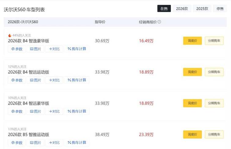 据新浪科技报道,在懂车帝上,沃尔沃S60的经销商报价为16.49万—25.89万元,而厂商指导价为30.69万—38.49万元,相当于最低打了近五折。此外,沃尔沃XC70的经销商报价为26.99万—34.99万元,厂商指导价为41.69万—49.69万元,相当于最低打六折。还有多款车型给出不小的优惠,比如沃尔沃XC60的经销商报价比厂商指导价下降15.2万元,沃尔沃S90的经销商报价比厂商指导价下降15.4万元。