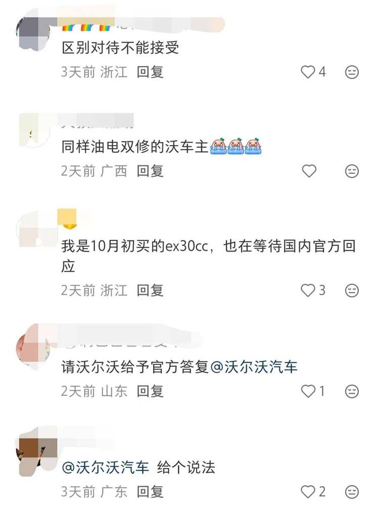 但近期,她偶然刷到了沃尔沃在全球召回EX30的新闻,仔细看之后发现,自己车辆的生产日期、电池供应商与召回信息高度重合。但翻遍了国内沃尔沃官网、车友群,甚至问了4S店,都没有任何公告、通知,甚至是一个解释。她直言,明明风险已被公开,海外车主都被郑重对待,把中国车主遗忘了?