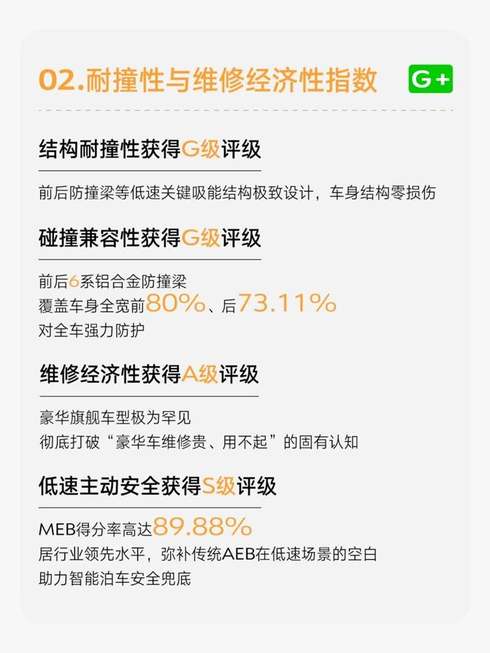 在耐撞性与维修经济性指数方面,腾势N9获得G+级评价。其中,结构耐撞性获得G级评级,这一优秀成绩背后,是其前后防撞梁等低速关键吸能结构极致设计,因而车身结构零损伤。此外,低速主动安全获得S级评价,MEB得分率高达89.98%,居于行业领先水平,弥补了传统AEB在低速场景的空白,为智能泊车安全兜底。