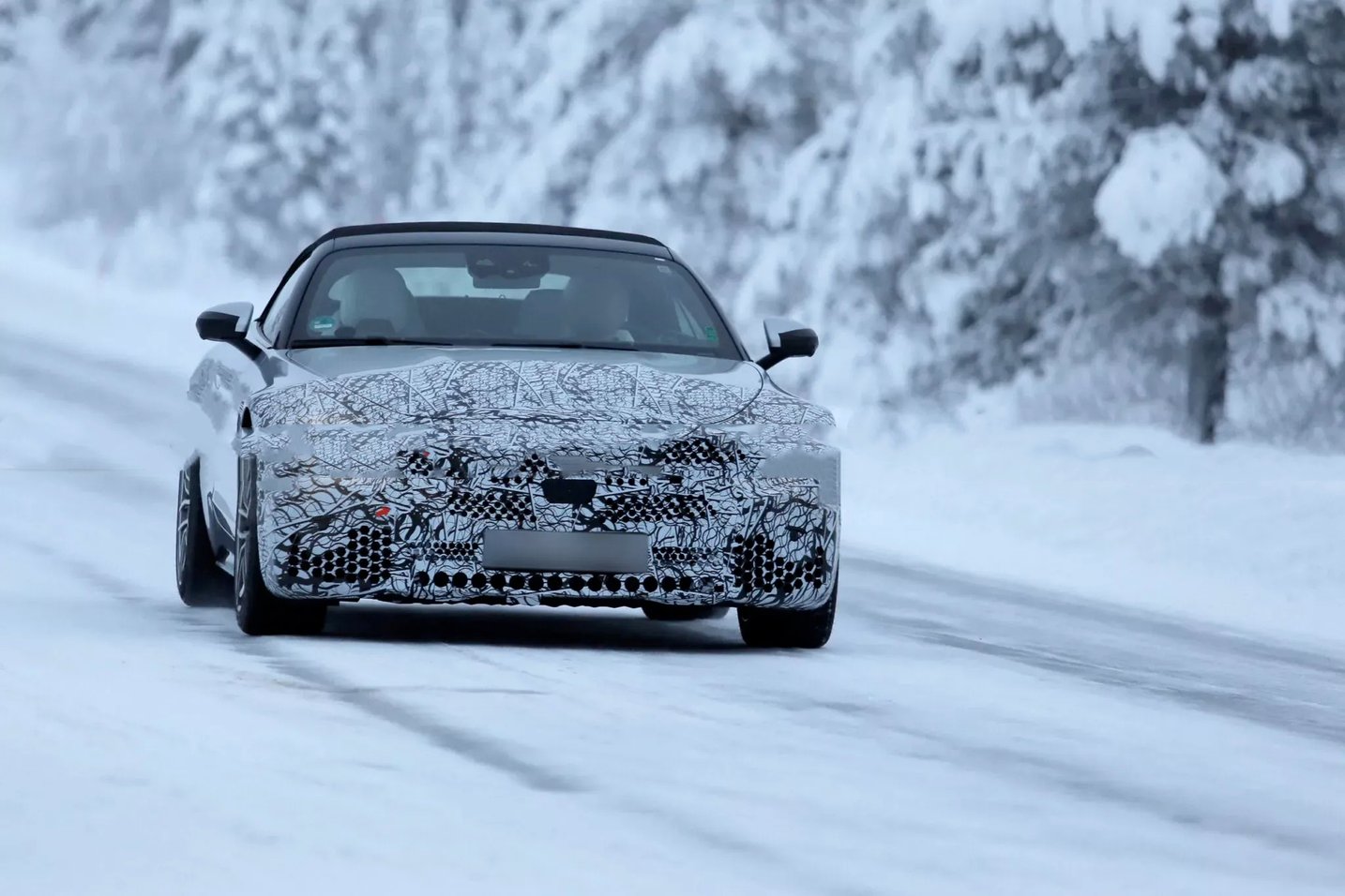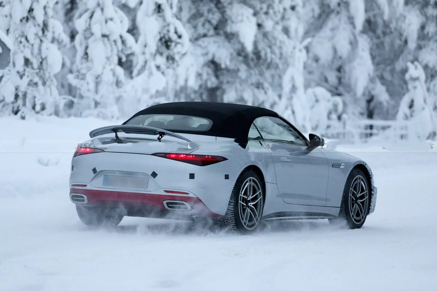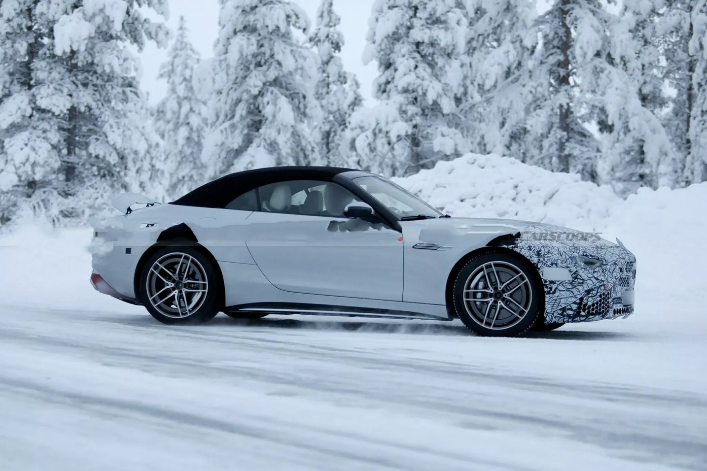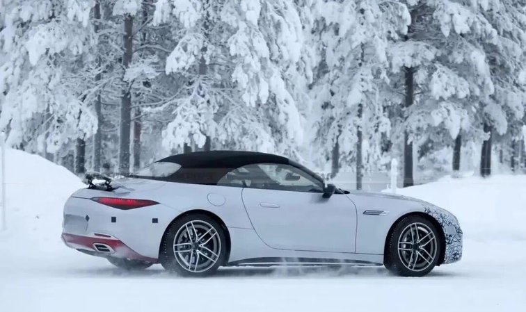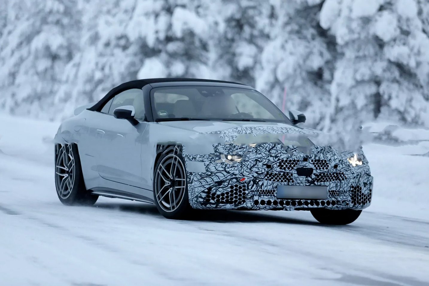 从谍照来看,新车前脸虽覆盖严密伪装,但星徽样式大灯与尺寸扩容的进气格栅轮廓清晰可辨。前保险杠采用全新设计,进气口进一步加大并优化导流结构,旨在强化散热效率与空气动力学表现。车身侧面延续软顶敞篷结构与弹出式门把手设计,搭配双五辐式运动轮毂,动感姿态依旧;车尾部分,电动扰流板、熏黑三角尾灯与双边共四出排气布局得以保留,后保险杠造型疑似借鉴迈巴赫SL的设计元素,量产版或在此基础上做进一步调整。