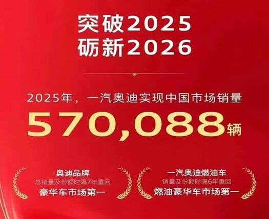 根据行业数据,2025年全年,一汽奥迪品牌累计批发销量为566,988辆(含进口车),凭借这一销量,一汽奥迪在2025年时隔六年重回国内豪华品牌燃油车市场份额第一的位置。