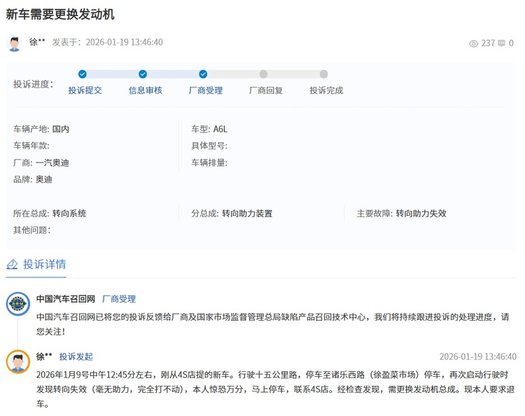 更值得警惕的是,降价背后可能隐藏着对产品质量与服务水准的潜在影响。2026年1月9日,全国缺陷产品投诉平台收到一则消费者投诉,一位刚提奥迪A6L新车的车主表示,车辆仅行驶15公里后转向助力便完全失效(毫无助力,完全打不动),联系4S店检查后被告知需要更换发动机总成。