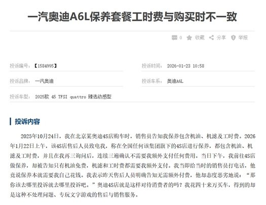 同样,售后服务也是消费者诟病的一大焦点。在车质网上,有消费者投诉奥迪4S店在保养套餐承诺上存在不一致现象,销售时承诺的“全包”保养在实际执行时却需要额外支付多项费用。这类服务纠纷并非偶发事件,在今年1月、去年4月和7月都有相关投诉记录,这不仅损害了消费者权益,也在不断侵蚀着一汽奥迪的品牌信誉。