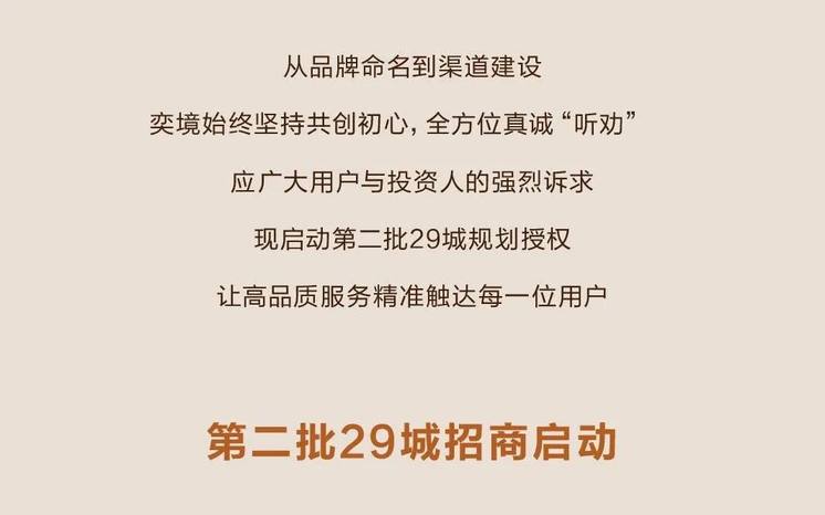 品牌方表示,将坚持“少商多店,优中选优”原则,通过阶梯式完善城市布局来保障每一位合作伙伴的盈利空间与长远发展,并构筑高效、共赢、可持续的渠道商业体系。具体来看,奕境将以每1家用户中心为核心服务枢纽,并开设N家商超店作为其“轻量化触点”。