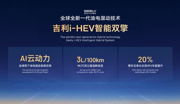 其实了解吉利汽车的都清楚,它在混动领域早已深耕多年,继雷神AI电混2.0、浩瀚超级电混SEP之后,i-HEV智能双擎也融合了全球最好的动力系统和全球领先的三电技术,它不仅是全球首个应用“AI云动力”的油电混动系统,还实现将整车功率比主流HEV提升至少20%,既能让燃油车也拥有十足电感,又能将HEV的百公里油耗降低至3L,领先于日系主流品牌的6L,难怪吉利汽车敢喊出这是一款足以超越“日系混动”的全球新一代油电混动产品,确实有这个实力!