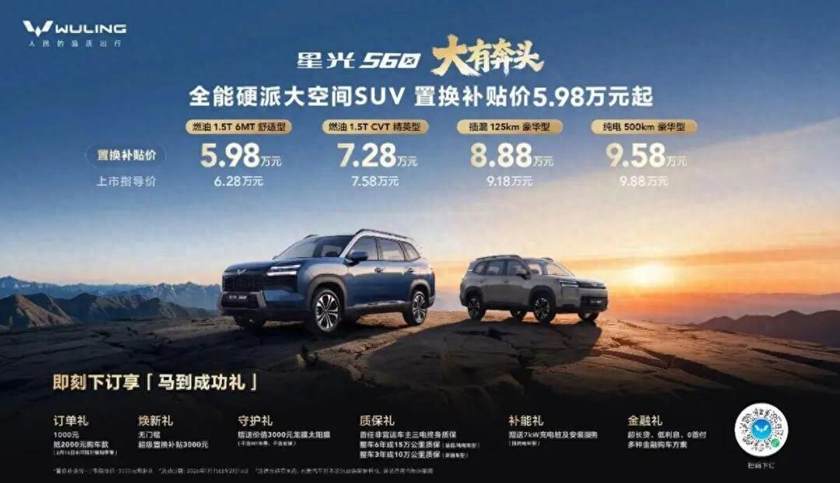 1月24日,五菱汽车在济南隆重举办“全能硬派大空间SUV”星光560品鉴发布会,新车正式宣布登陆市场。此次推出的星光560以“价值颠覆者”为定位,提供燃油、插电混动及纯电三种动力版本,共四款配置车型,置换补贴后价格区间为5.98万元至9.58万元,以超乎预期的产品力与诚意售价,为消费者带来全新选择。
