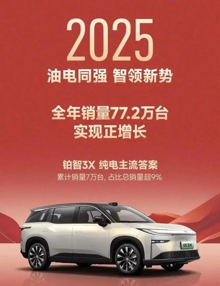 如果仅仅是夯实燃油车的基本盘,广汽丰田的表现就只是稳健,而谈不上强势,“油电同强”才是广汽丰田能在艰难市场环境中稳步前行的最强底气。2025年是广汽丰田新能源的突破之年,铂智3X去年3月上市,不到10个月累计销量就突破了7万台,不仅登顶合资新能源车型年度销冠,更在去年12月一举夺得纯电动紧凑型SUV的全行业销冠。铂智3X也助力广汽丰田超过了一众在新能源领域转型更早、投入更大的对手,夺得当月合资车企新能源销量冠军。