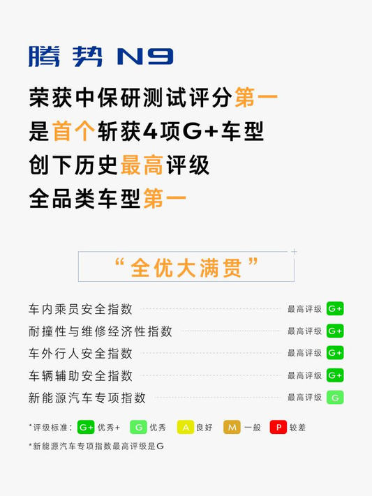 2026年1月21日,中国保险汽车安全指数(C-IASI)正式发布2025年测评车型第二次结果,腾势N9荣获中保研测试评分第一,是首个斩获4项G+的车型,创下历史最高评级,同时也是中保研全品类车型第一名,在五大维度均获得历史最高评级,强势通过所有测试项目,用实力重新定义安全天花板,为车主出行提供极致安全保障。