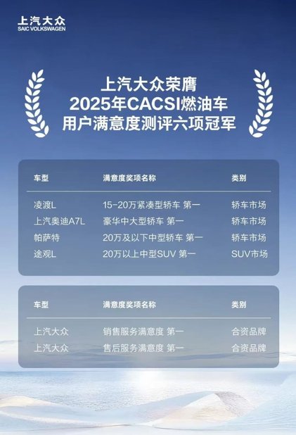 2025年上汽大众荣获CACSI(中国汽车行业用户满意度指数)合资品牌销售服务与售后服务双料冠军。