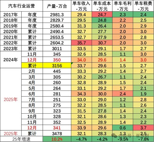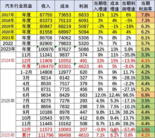 根据乘联会秘书长崔东树发布的最新数据,2025年中国汽车行业在产销规模扩大的同时,整体利润表现却创下新低。2025年1-12月,汽车行业收入111796亿元,同比增长7.1%;利润为4610亿元,同比微增0.6%;行业利润率仅为4.1%,明显低于下游工业企业5.9%的平均水平。
