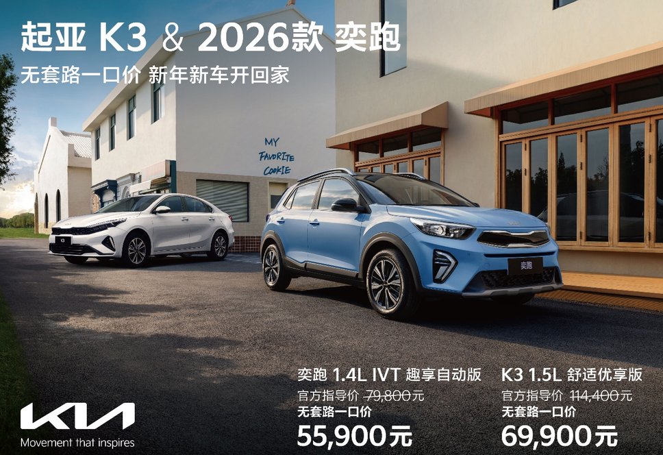 在“全国一口价”政策之下,起亚K3 1.5L舒适优享版全国一口价仅需69,900元、2026款起亚奕跑1.4L IVT趣享自动版全国一口价仅需55,900元,不仅大大降低了消费者的购车门槛,也为用户创造了更公开、更透明、无套路的购车环境。