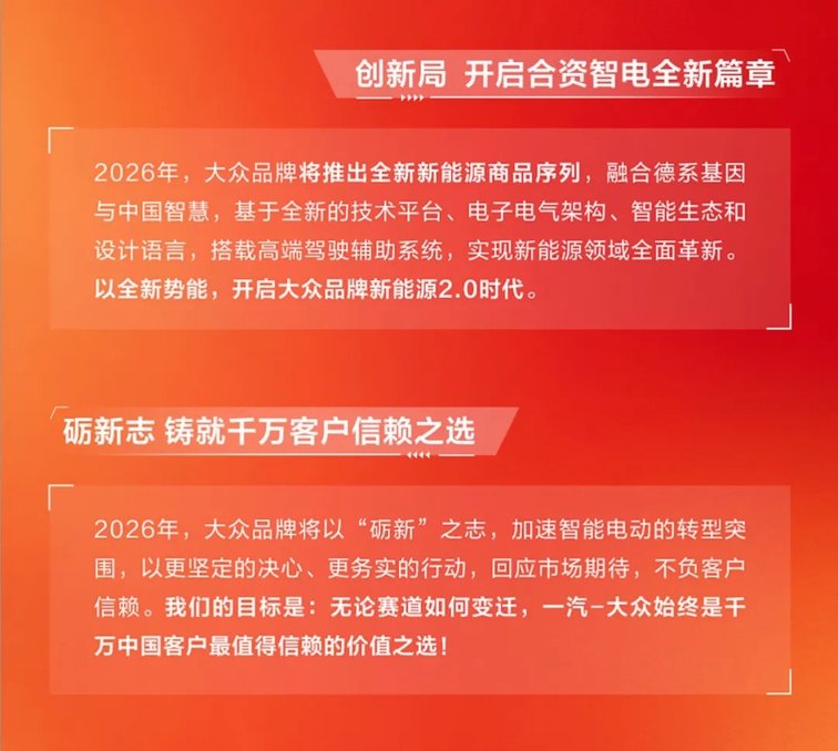 刚刚召开的2026一汽-大众新闻年会,正是这种蓄力的集中释放。但如果仅仅将其理解为多推几款新车,便低估了这场变革的深度。从已释放的信息看,一汽-大众正在进行的不是修补式的改进,而是体系性的重构;不是跟随式的追赶,而是赛道级的换道。