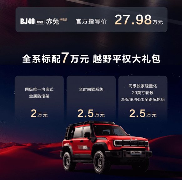 BJ40增程赤兔标准版官方指导价27.98万元!购车即可享有价值7万元的“越野平权大礼包”,包含价值2万元的同级唯一内嵌式金属防滚架、价值2.5万元的全时四驱系统和价值2.5万元的同级唯一轻量化20英寸轮毂与295/60 R20全路况轮胎。
