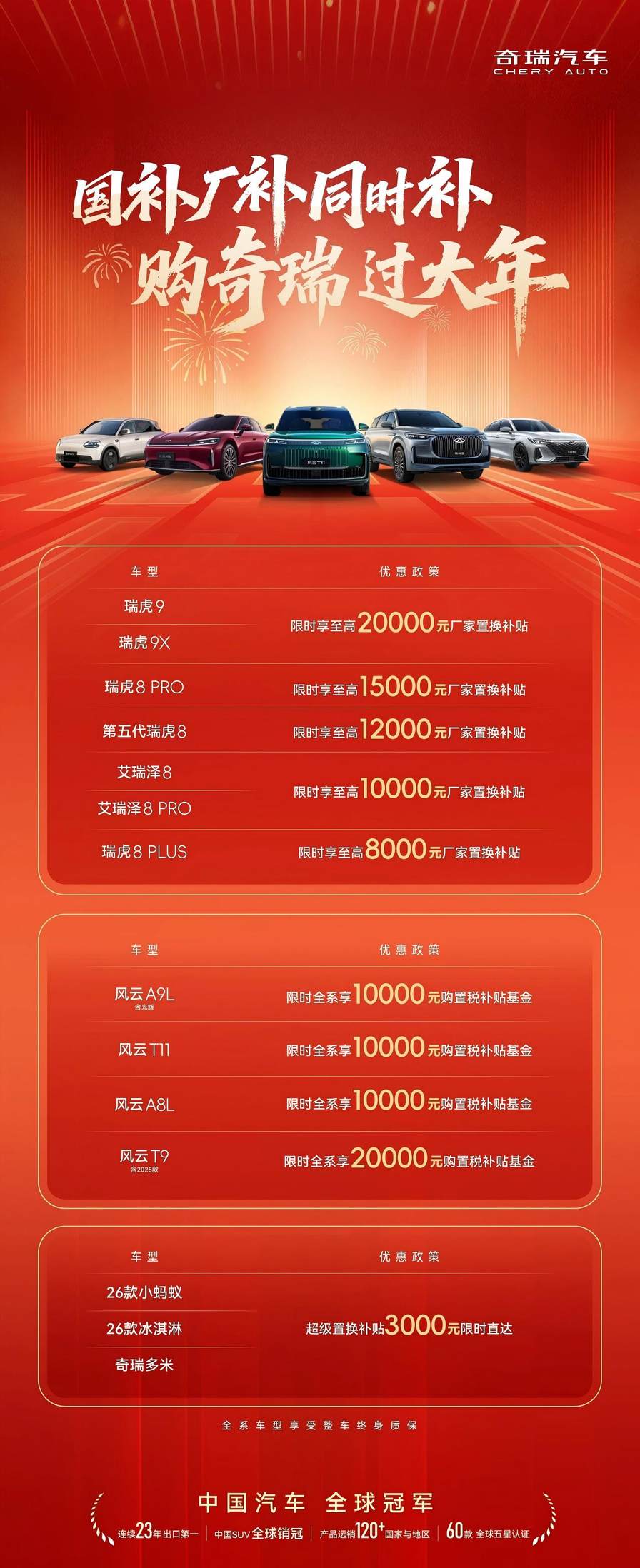值此新春佳节,正是购车换新的黄金时节。为回馈广大用户的支持,奇瑞还推出“国补厂补同时补”新年政策,燃油、新能源等多款热销车型可享受超值厂家补贴,至高可达20,000元。厂补之外,用户还可享受国补以旧换新,进一步降低消费者换购门槛。除了丰厚补贴之外,真诚实在的奇瑞还将通过全系整车终身质保,为用户提供全方位的用车保障,打消后顾之忧。