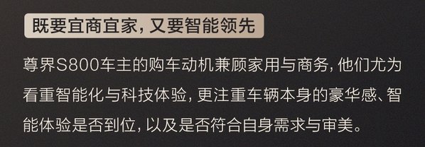 这让他们选择尊界S800,既能满足商务场合彰显身份的需求,也能享受到前沿的智能科技体验。