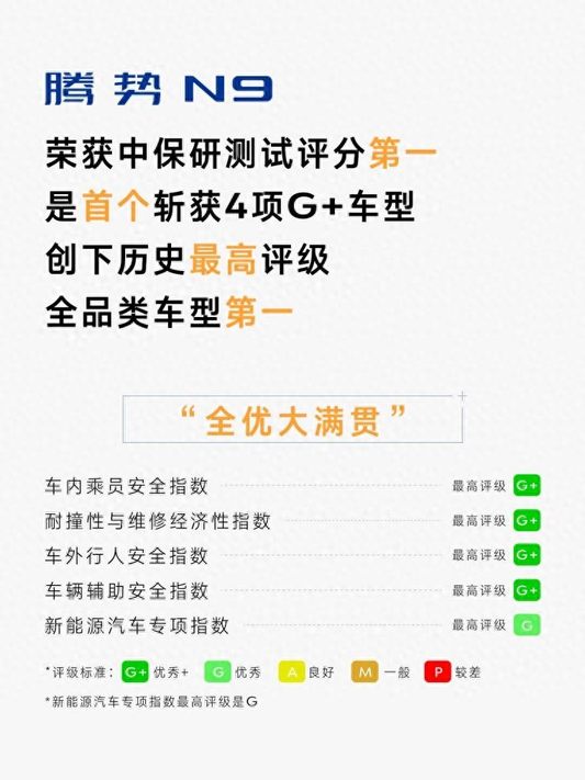 腾势N9在车内乘员安全指数、耐撞性与维修经济性指数、车外行人安全指数、车辆辅助安全指数四大核心分指数中均斩获最高等级G+评级,新能源汽车专项指数获G评级,全维度卓越安全成绩。在中国保险汽车安全指数C-IASI测试成绩中,腾势N9实现全优大满贯!是名副其实的安全之王。